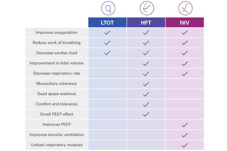 LTOT-behandling og HFT- og NIV-behandling i hjemmet kan bruges separat eller i kombination til hjemmebaseret behandling af KOL-patienter. Nogle af fordelene ved hver enkelt metode er vist i tabellen.